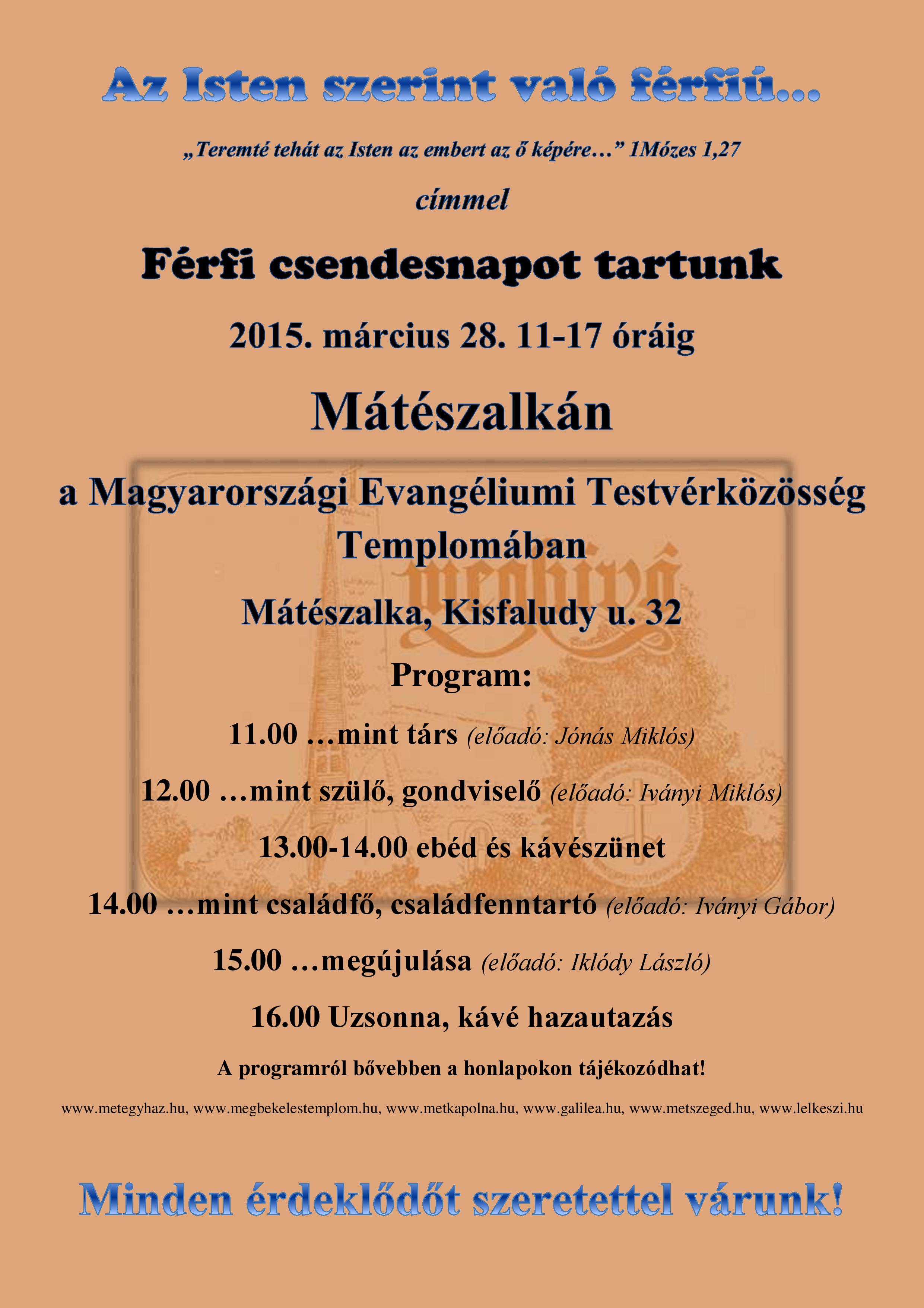 Rohamosan átalakuló, változó világunkban egyre nehezebb megfogalmazni azokat a hagyományos szerepeket (férfi, nő, család), amelyek a társadalomban elfoglalt helyünket definiálná. A megváltozott családfogalom, a társadalom homogenizálódása egyre gyakrabban felveti azt a kérdést, van-e létjogosultsága a „hagyományos modelleknek”, vagy túlhaladta a kor, és „újakat” kell keresni a „régiek” kiváltására, igazodva az igényekhez. Erre keressük a választ a tavaszi férfi „csendesnapunkon”, a férfi szerepköreit vizsgálva (mint társ /férj/, mint szülő /gondviselő/, mint családfő és családfenntartó). Mindezek mellett megvizsgáljuk azt is, hogy megtarthatja-e (ha igen, milyen mértékben) a férfi személyes identitását, és van-e lehetősége a feltöltődésre, megújulásra.